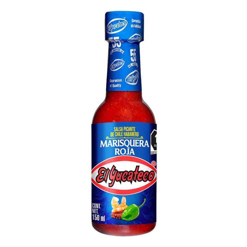 Botella de 150 ml de salsa marisquera de habanero con chiles secos, El Yucateco.